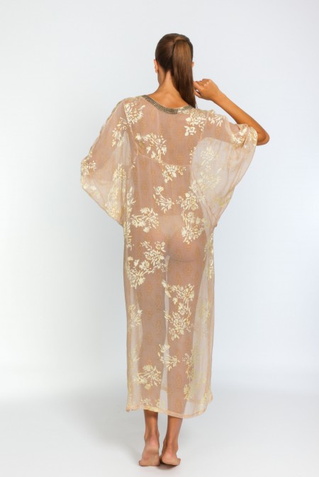 This long and luxurious 100% burn out silk kaftan comes in a shimmering gold that has a super luxe feel.