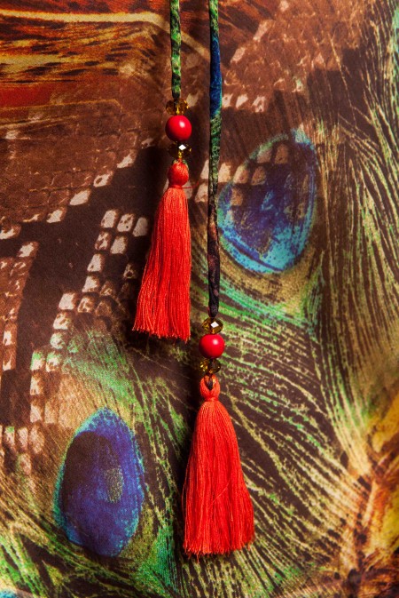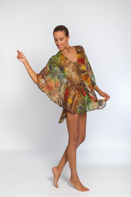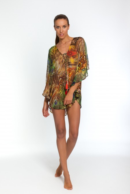 This Eliptica kaftan comes in a gorgeous eyecatching peacock print in tawny hues with flashes of red and green throughout.
