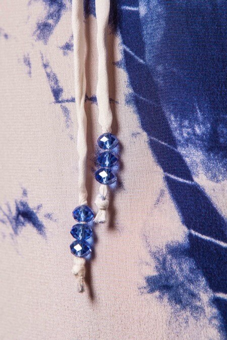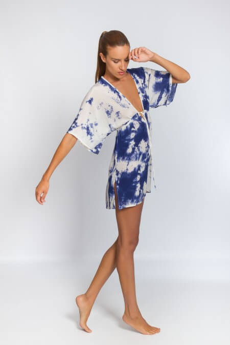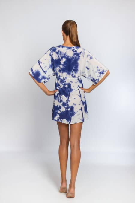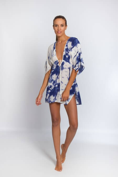 This stunning 100% crepe de chine silk kaftan comes in a fresh navy tye dye effect. Its empire line cut gives it shape and definition, while its plunging neckline, open kimono sleeves and side splits add to its luxe look. This piece is a beach to bar staple.